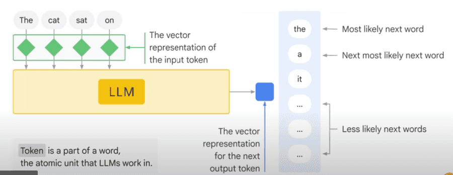 일반 언어 모델이 예측하는 다음 단어, 즉 전문 용어로 ‘토큰’은 학습 데이터의 언어를 기반으로 합니다. 이것은 일반 언어 모델의 예입니다. 다음 단어는 학습 데이터의 언어를 기반으로 하는 토큰입니다. 예를 들어 ‘cat sat on’ 다음에 올 단어는 ‘the’여야 하는데, ‘the’가 다음 단어일 가능성이 가장 크다는 것을 알 수 있습니다. 검색에서 사용하는 ‘자동 완성’이라고 생각하시면 됩니다.